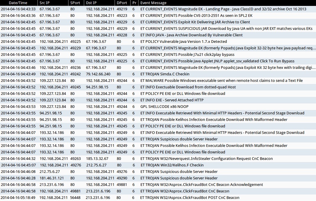 - 2014-04-16 04:43:45 UTC - 67.196.3[.]67:80 - ET CURRENT_EVENTS Exploit Kit Delivering JAR Archive to Client