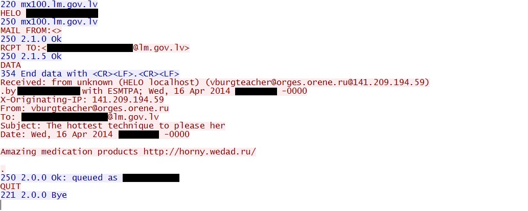 An example of the spam that was briefly sent from my infected host. The mail has a spoofed sender and spoofed sending IP address: