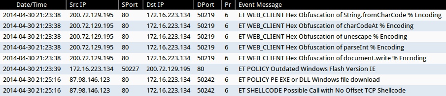 - 2014-04-30 21:23:38 UTC - 200.72.129[.]195:80 - ET WEB_CLIENT Hex Obfuscation of String.fromCharCode % Encoding