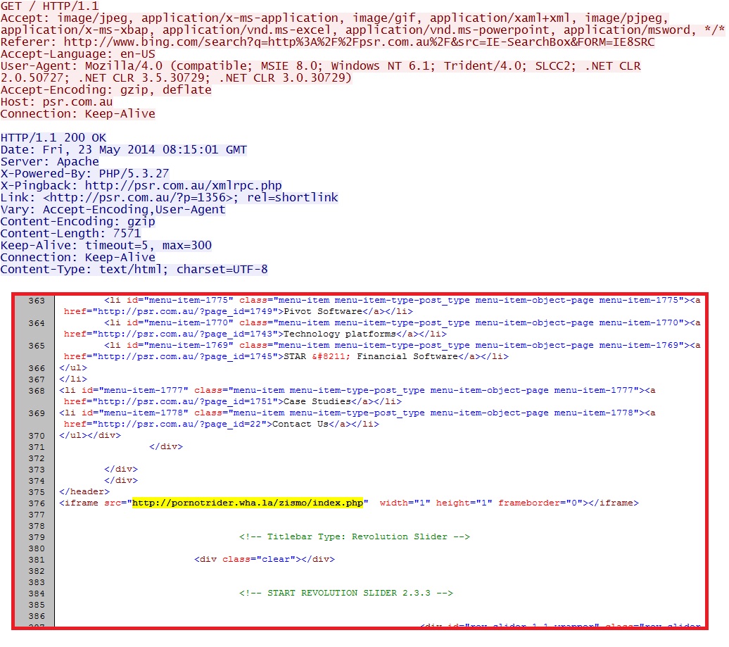 From psr[.]com[.]au (compromised website) to pornotrider.wha[.]la (first redirect):
