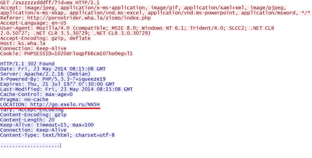 From ks.wha[.]la (second redirect) to go.exelo[.]ru (third redirect):