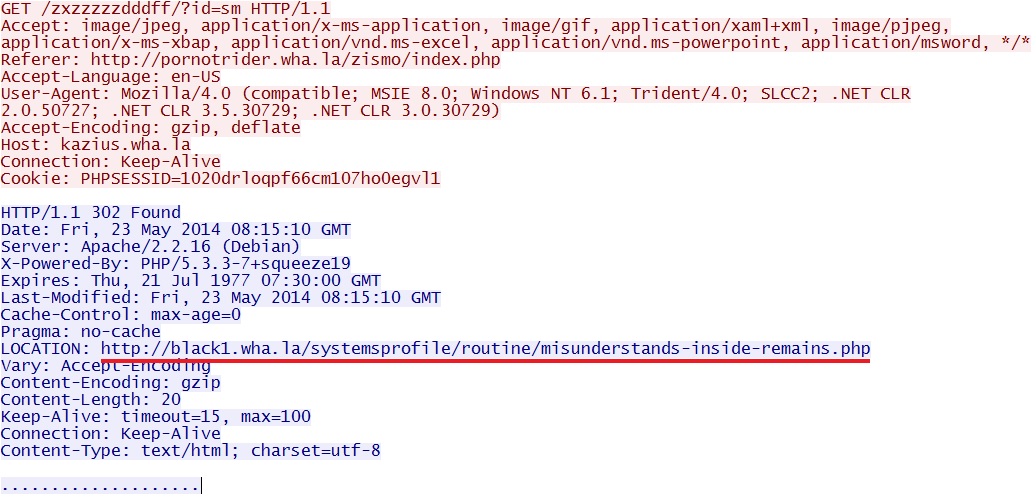 From kazius.wha[.]la (fourth redirect) to black1.wha[.]la (Blackhole EK):