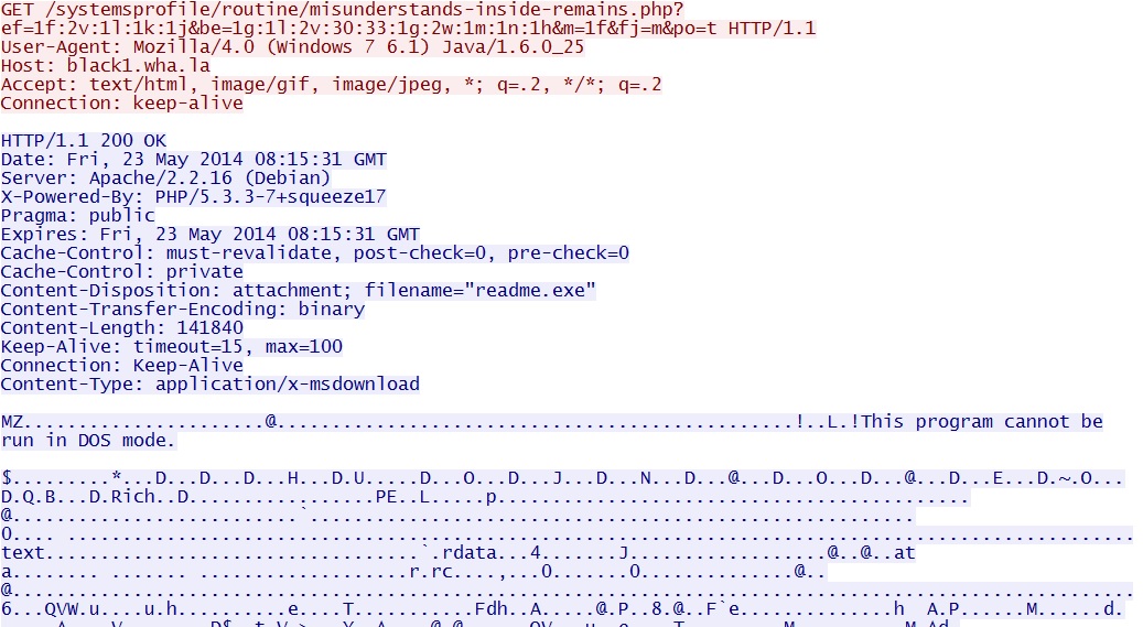 - 2014-05-23 08:15:31 UTC - 109.120.173[.]4:80 - ET CURRENT_EVENTS DRIVEBY Blackhole - Payload Download - readme.exe (sid:2014301)