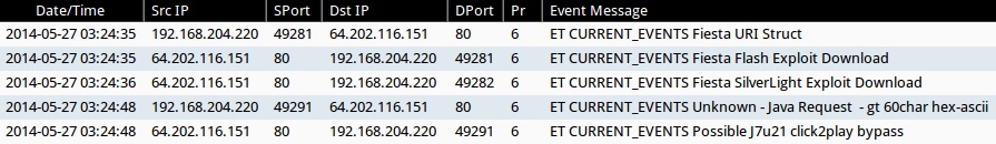 - 2014-05-27 03:24:36 UTC - 64.202.116[.]151:80 - ET CURRENT_EVENTS Fiesta SilverLight Exploit Download (sid:2018409)