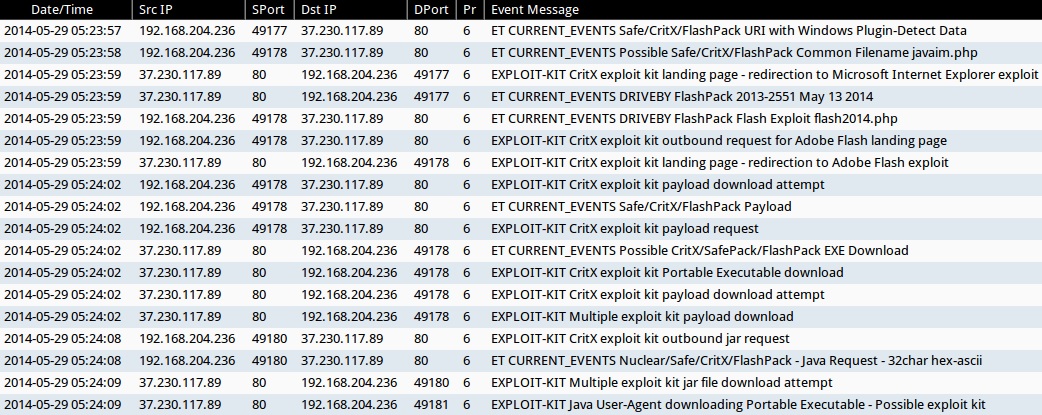 - 2014-05-29 05:23:57 UTC - 37.230.117[.]89:80 - ET CURRENT_EVENTS Safe/CritX/FlashPack URI with Windows Plugin-Detect Data (sid:2017812)
