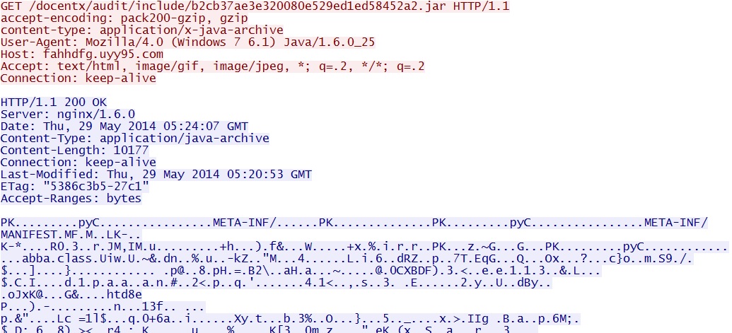 - 05:24:07 UTC - 37.230.117[.]89:80 - fahhdfg.uyy95[.]com - GET /docentx/audit/include/b2cb37ae3e320080e529ed1ed58452a2.jar