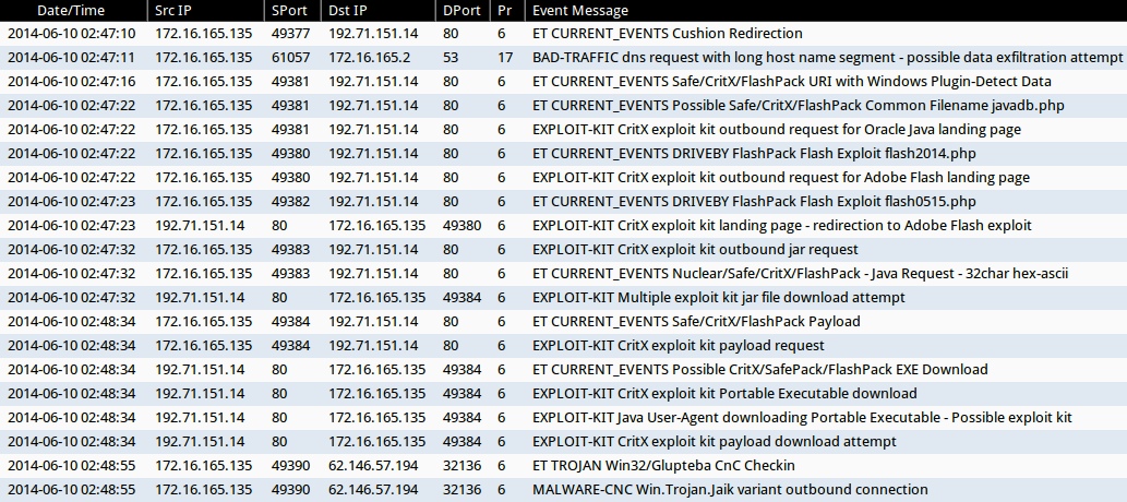 - 2014-06-10 02:47:16 UTC - 192.71.151[.]14:80 - ET CURRENT_EVENTS Safe/CritX/FlashPack URI with Windows Plugin-Detect Data (sid:2017812)