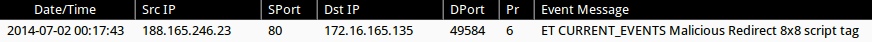 - 188.165.246[.]23:80 - ET CURRENT_EVENTS Malicious Redirect 8x8 script tag (sid:2018053)