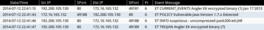 - 2014-07-12 22:41:13 UTC - 192.200.105[.]130:80 - ET CURRENT_EVENTS Angler EK encrypted binary (1) Jan 17 2013 (sid:2017984)