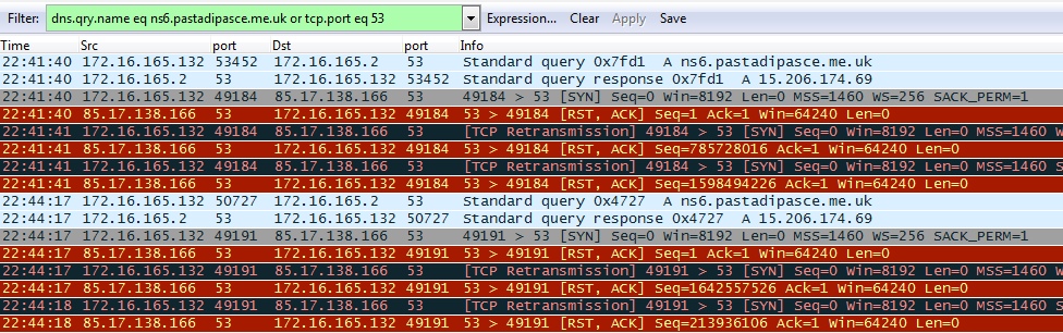 - 22:41:40 UTC - 85.17.138[.]166:53 - [RST, ACK]