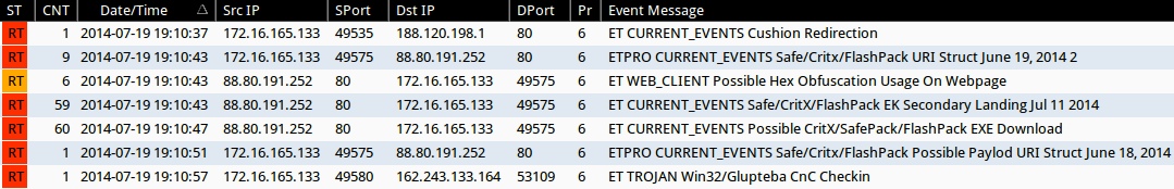 - 19:10:43 UTC - 88.80.191[.]252:80 - ET CURRENT_EVENTS Safe/CritX/FlashPack EK Secondary Landing Jul 11 2014 (sid:2018668)