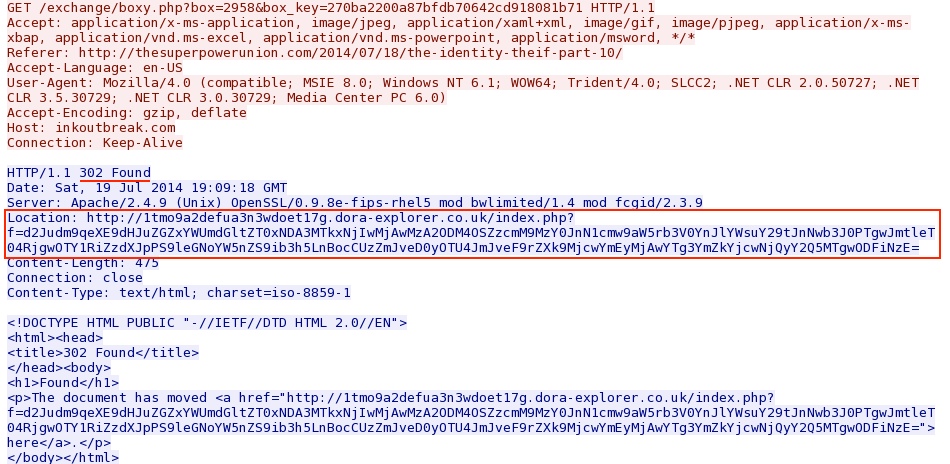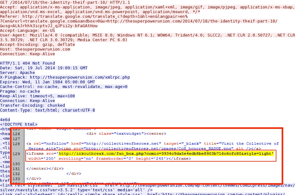 - 19:10:33 UTC - 97.74.183[.]1:80 - thesuperpowerunion[.]com - GET /2014/07/18/the-identity-theif-part-10/