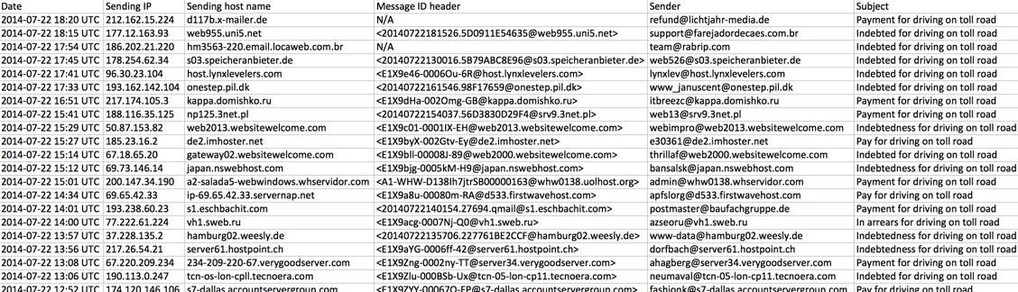 - However, this post includes a spreasheet with sending IP addresses, sending host names, message ID headers, subject lines I've run across in the last 24 hours.