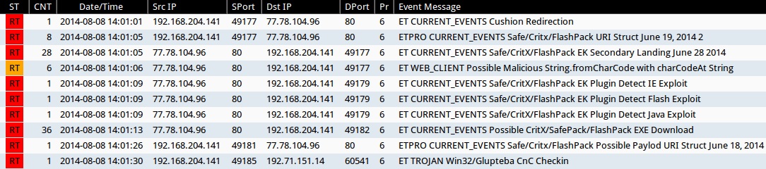 - 14:01:09 UTC - 77.78.104[.]96:80 - ET CURRENT_EVENTS Safe/CritX/FlashPack EK Plugin Detect IE Exploit (sid:2018795)