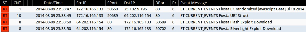 - 2014-08-09 23:38:52 UTC - 64.202.116[.]154 - [1:29443:6] EXPLOIT-KIT Fiesta exploit kit outbound connection attempt