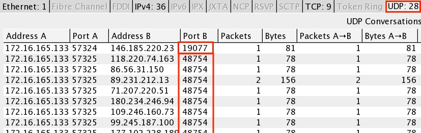 UDP traffic to different hosts... First using UDP port 19077, then UDP port 48754: