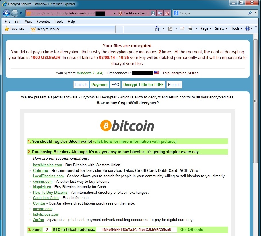 - Bitcoin address for the CryptoWall ransom payment is: 1M4pN4rH4LfXuTaJCL5tpnXJkbVRC35saU