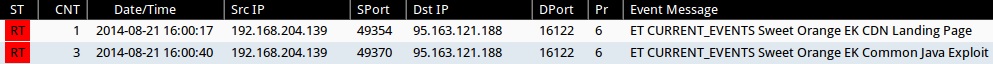 - 2014-08-21 16:00:40 UTC - 95.163.121[.]188:16122 - ET CURRENT_EVENTS Sweet Orange EK Common Java Exploit (sid:2018583)