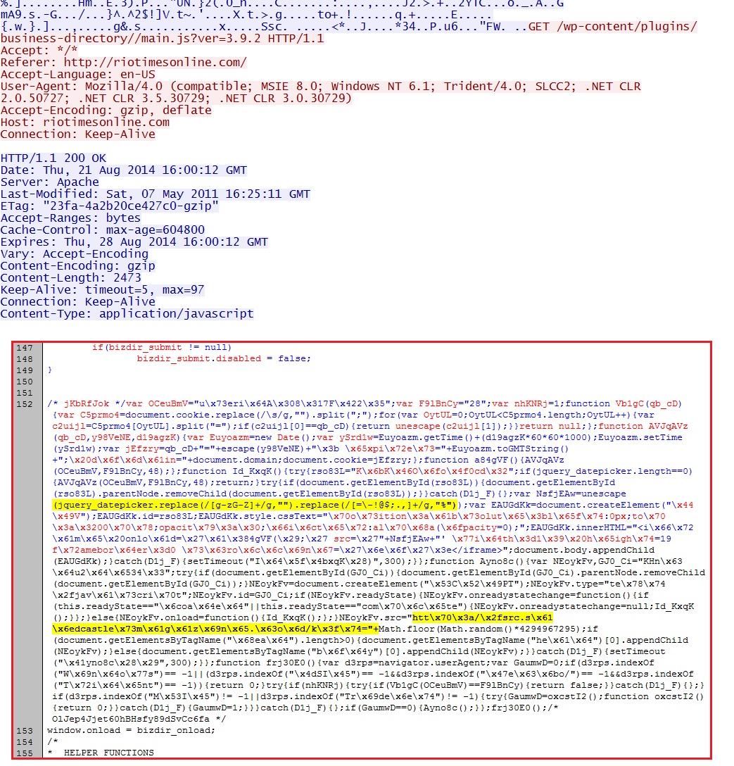 - 2014-08-21 16:00:12 UTC - 50.62.217[.]7:80 - riotimesonline[.]com - GET /wp-content/plugins/business-directory//main.js?ver=3.9.2