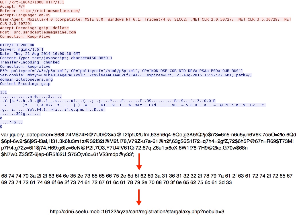 - 2014-08-21 16:00:17 UTC - 95.163.121[.]188:16122 - cdn5.seefu[.]mobi:16122 - GET /xyza/cart/registration/stargalaxy.php?nebula=3