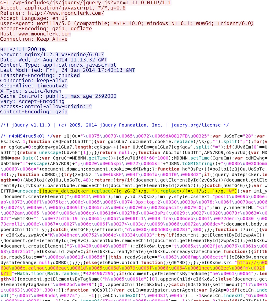 - 2014-08-27 11:13:32 UTC - www.moonclerk[.]com - GET /wp-includes/js/jquery/jquery.js?ver=1.11.0