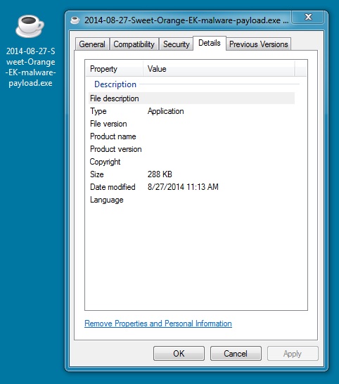 - Today's malware payload appears remarkably similar to the one sent by Sweet Orange EK on 2014-08-25, but with a different file hash ( link ).