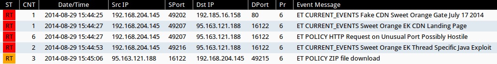 - 2014-08-29 15:44:27 UTC - 95.163.121[.]188:16122 - ET CURRENT_EVENTS Sweet Orange EK CDN Landing Page (sid:2018786)