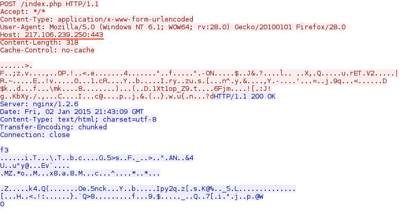 - 2015-01-02 21:42:22 UTC - 217.106.239[.]250:443 - POST /index.php