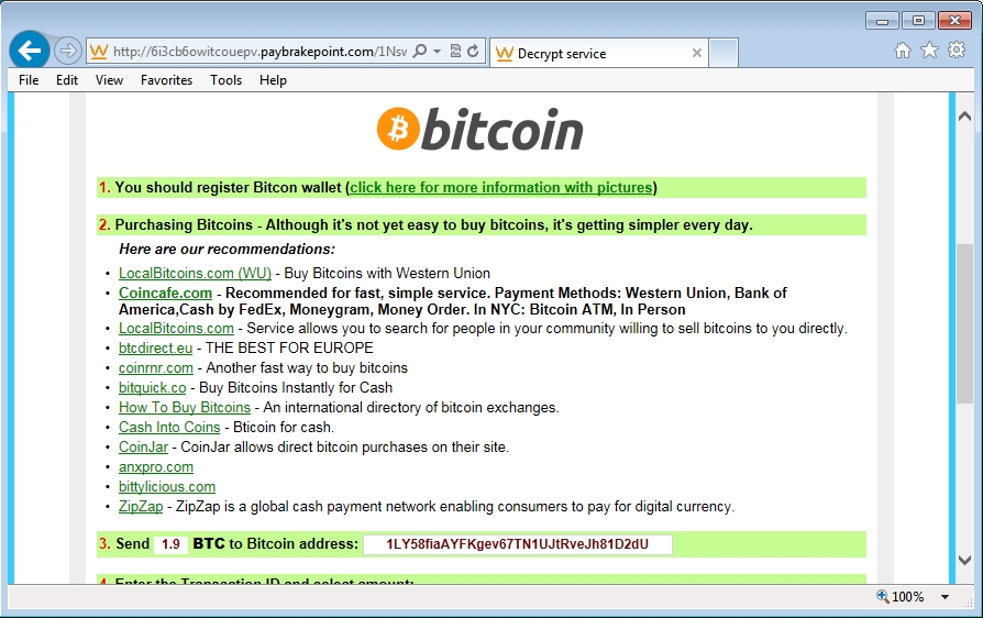 - Bitcoin address for this CryptoWall 3.0 ransomware sample is: 1LY58fiaAYFKgev67TN1UJtRveJh81D2dU