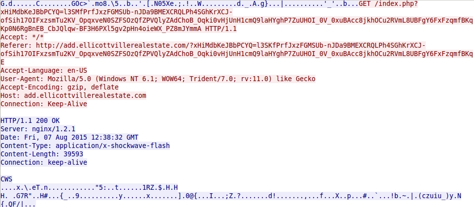 - 2015-08-07 12:38:32 UTC - add.ellicottvillerealestate[.]com - GET /index.php?xHiMdbKeJBbPCYQ=l3SMfPrfJxzFGMSUb-nJDa9BMEXCRQLPh4SGhKrXCJ-
