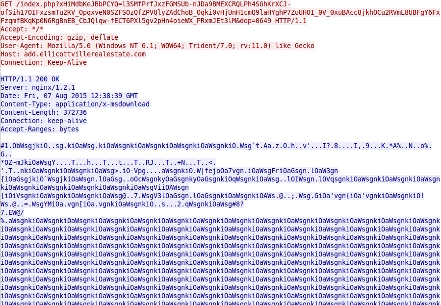 - 2015-08-07 12:38:37 UTC - add.ellicottvillerealestate[.]com - GET /index.php?xHiMdbKeJBbPCYQ=l3SMfPrfJxzFGMSUb-nJDa9BMEXCRQLPh4SGhKrXCJ-