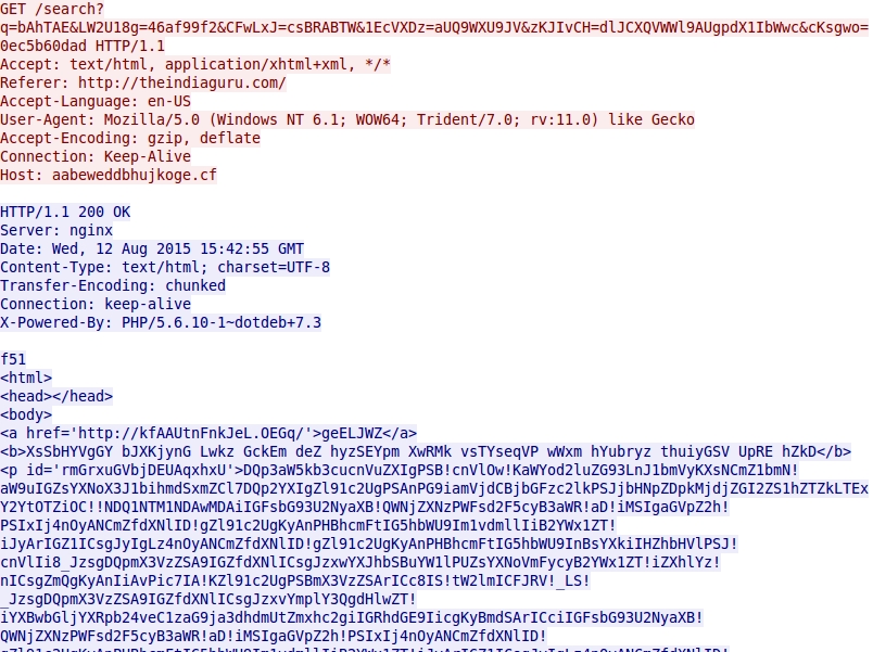 - 2015-08-12 15:42:56 UTC - aabeweddbhujkoge[.]cf - GET /search?q=bAhTAE&LW2U18g=46af99f2&CFwLxJ=csBRABTW&1EcVXDz=aUQ9WXU9JV&
