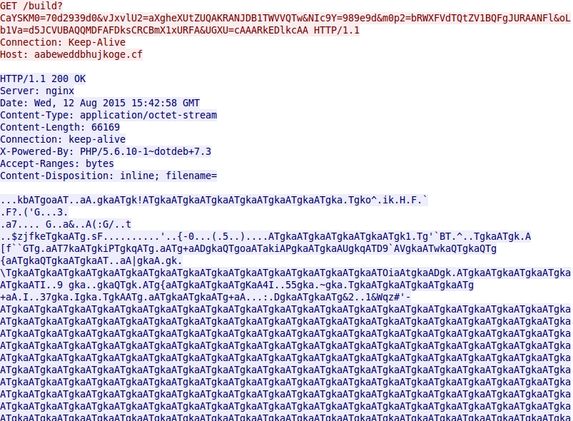 - 2015-08-12 15:42:58 UTC - aabeweddbhujkoge[.]cf - GET /build?CaYSKM0=70d2939d0&vJxvlU2=aXgheXUtZUQAKRANJDB1TWVVQTw&NIc9Y=