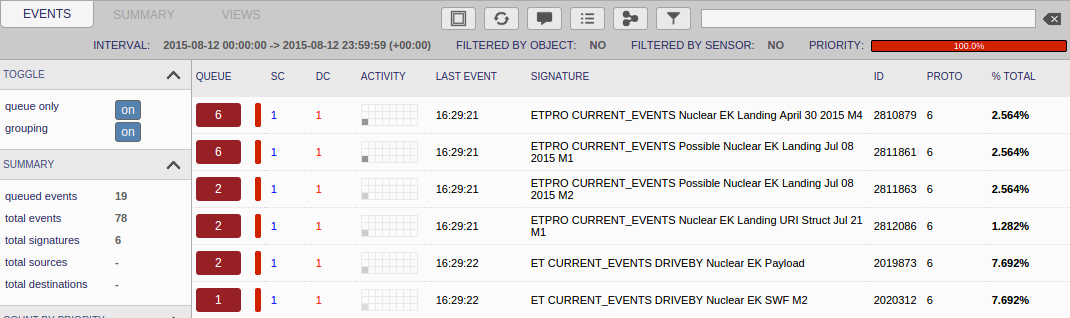 Suricata using the Emerging Threats open and ETpro rulesets on Security Onion (not including ET INFO or ET POLICY rules):