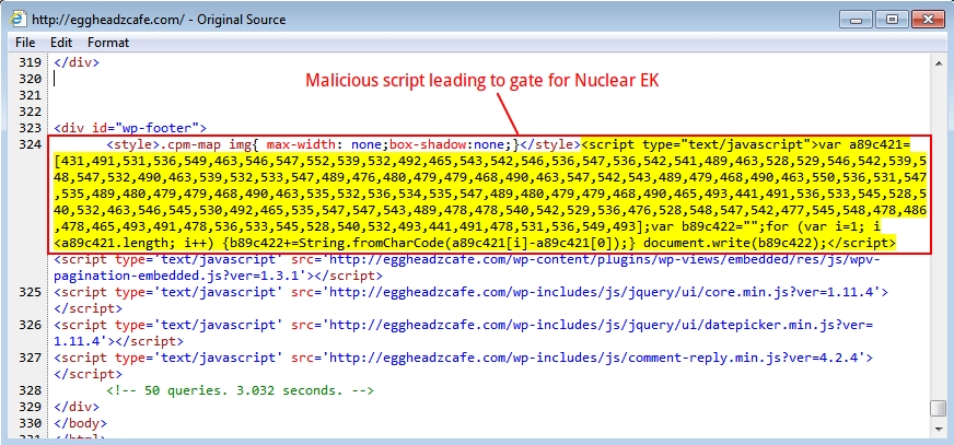 - Saw malicious script in page from the compromised website pointing to both Angler and Nuclear EK. Only got Nuclear EK this time.