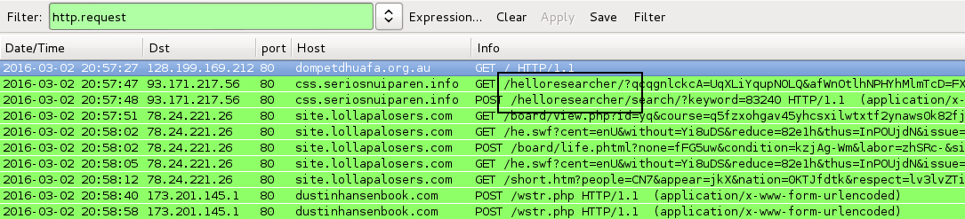 Shown above: Traffic from an infection filtered in Wireshark. As always, they know we're watching.