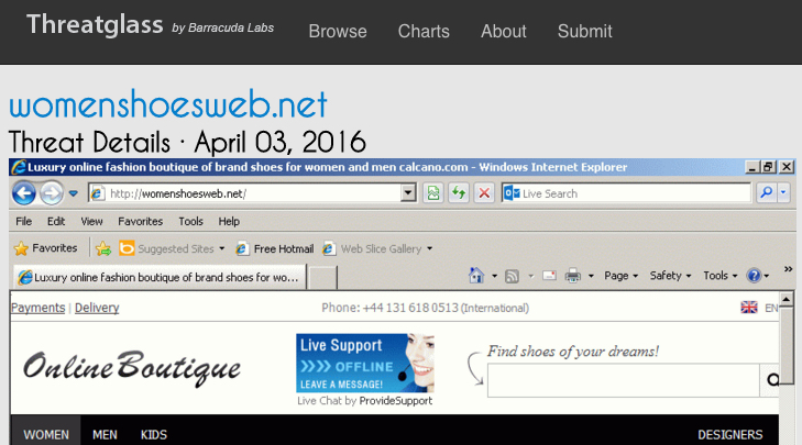 - womenshoesweb[.]net - GET /ya/rK2M8tX6EgLqbFVyTc_NZA/1459797806 - Returned 302 redirect to Angler EK landing page