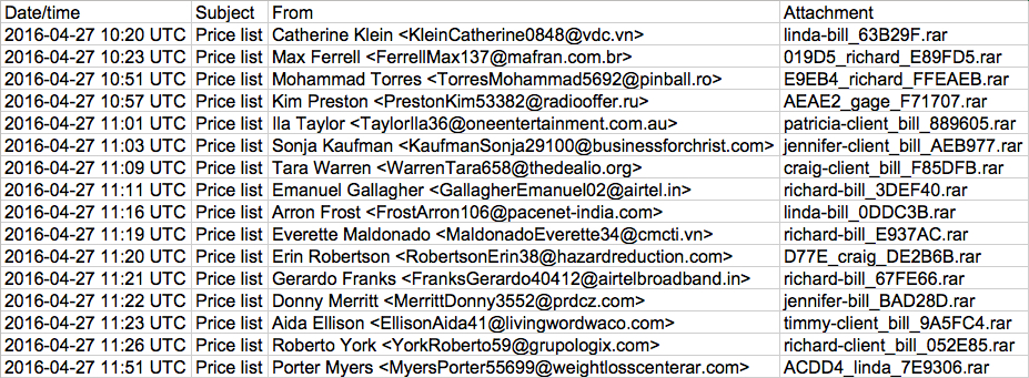 Shown above: Data on 16 of emails from this wave of emails pushing Locky ransomware.