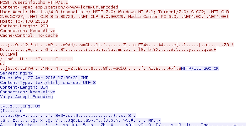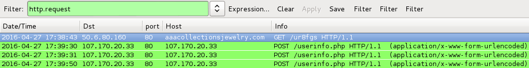 - 2016-04-27 17:39:30 UTC - 107.170.20[.]33 port 80 - 107.170.20[.]33 - POST /userinfo.php
