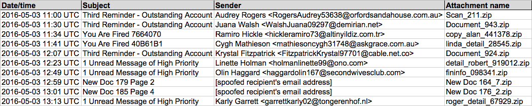 Shown above: Data from the .csv spreadsheet on 10 emails from today's Locky ransomware.
