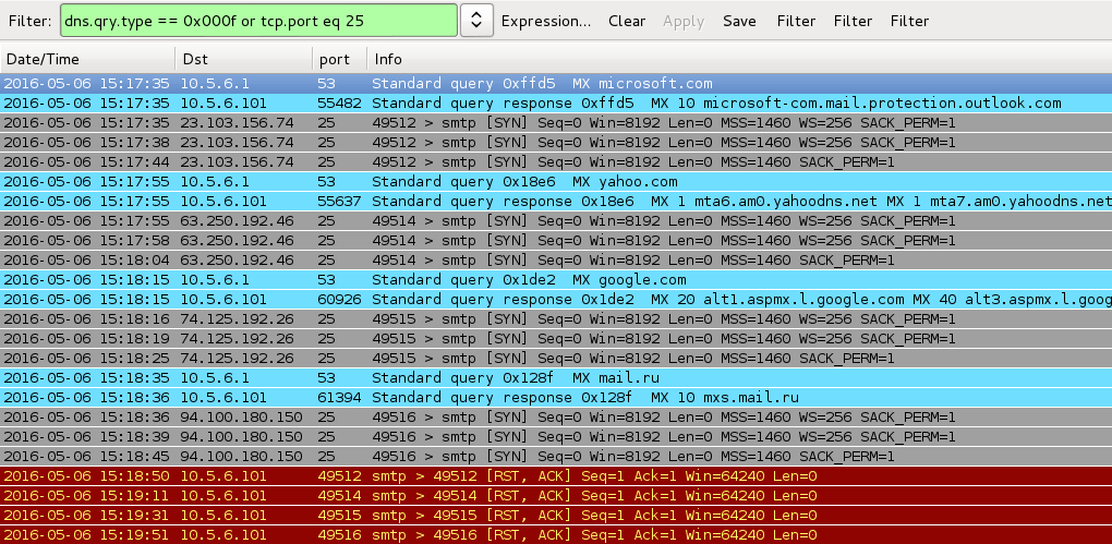 Shown above: Filtering in Wireshark to show the attempted SMTP traffic: dns.qry.type == 0x000f or tcp.port eq 25.