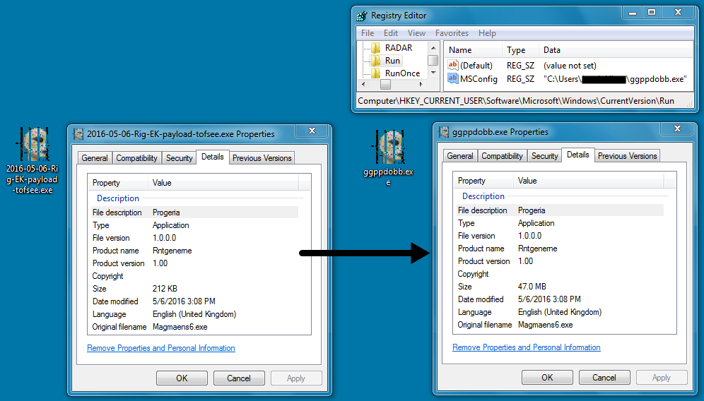 Shown above: Malware dropped by the Rig EK Tofsee payload.
