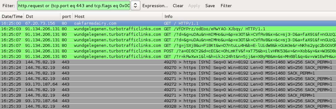 Shown aboe: Pcap of the traffic filtered in Wireshark, second run http.request or (tcp.port eq 443 and tcp.flags eq 0x0002)