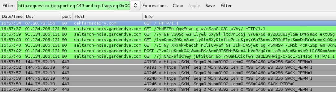 Shown aboe: Pcap of the traffic filtered in Wireshark, first run http.request or (tcp.port eq 443 and tcp.flags eq 0x0002)
