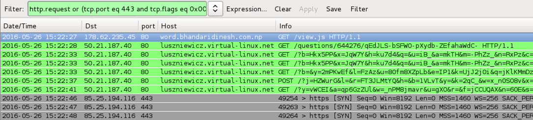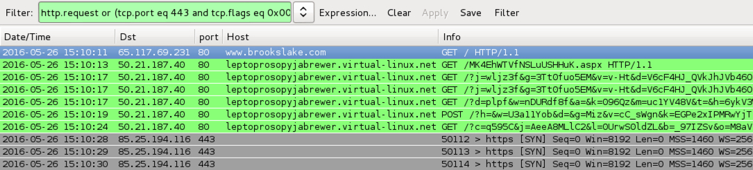 Shown above: Traffic from the pseudoDarkleech Angler EK filtered in Wireshark using the filter: http.request or (tcp.port eq 443 and tcp.flags eq 0x0002).
