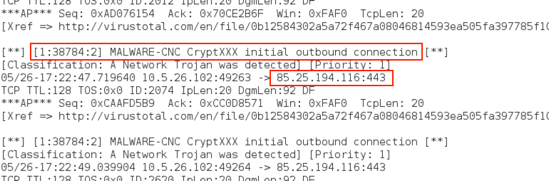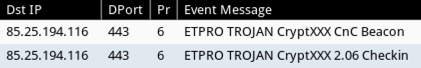 - 85.25.194[.]116 port 443 - CryptXXX ransomware callback traffic (custom encoded, not SSL)
