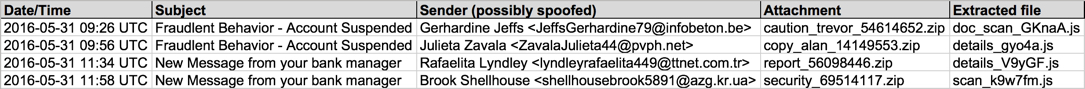 Shown above: Data from the .csv spreadsheet on 4 email samples from Tuesday 2016-05-31.
